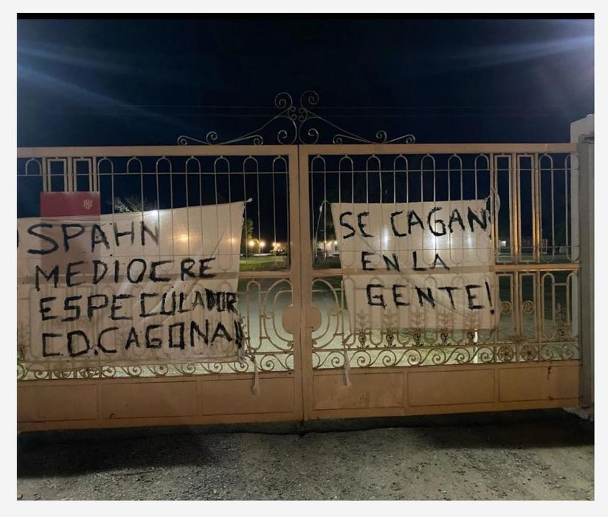 Uno de los carteles destaca: “Spahn mediocre, especulador”, y añade un fuerte cuestionamiento a la Comisión Directiva: “cagona”. Este mensaje también fue colocado en el predio ubicado en las afueras de Santa Fe. Además, otro pasacalle señala: “Se cagan en la gente”.