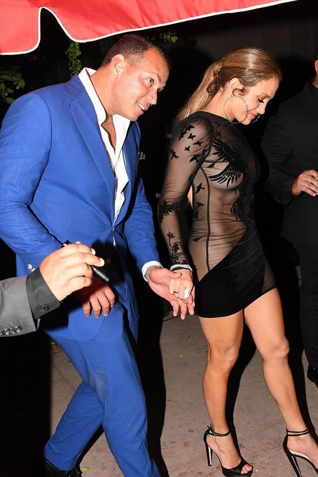 En pareja con el ex beisbolista Alex Rodríguez, JLo lució un vestido corto, entallado, con transparencias y un exuberante escote en la espalda.