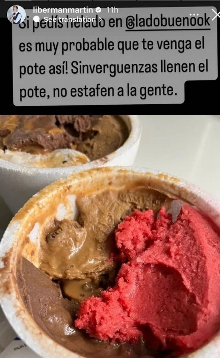 El periodista publicó una foto en su perfil de Instagram y denunció el incidente, expresando su indignación hacia la heladería "Lado Bueno": "Si pedís helado en @ladobuenook es muy probable que te venga el pote así. Sinvergüenzas, llenen el pote, no estafen a la gente".