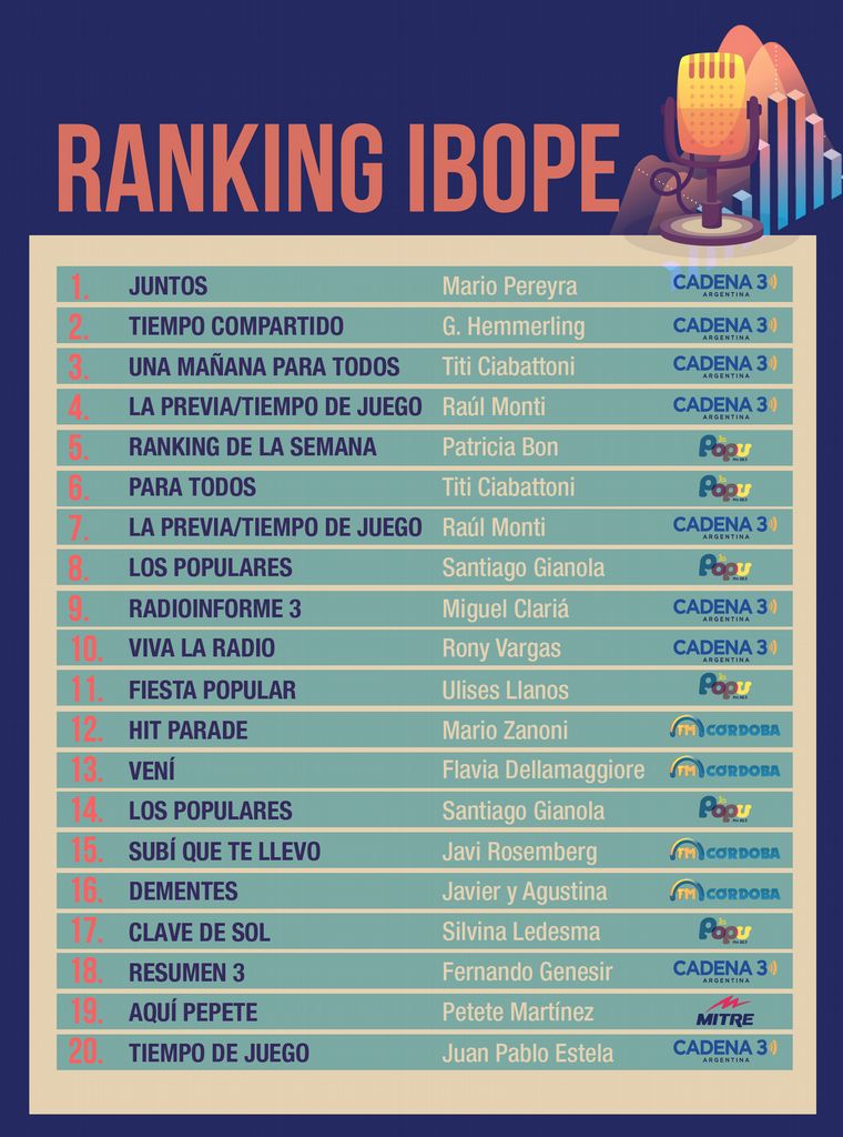De los 20 primeros, 19 son del Grupo Cadena 3, encabezados por los que transmite Cadena 3: Juntos, conducido por Mario Pereyra, de lunes a viernes; seguido por Tiempo Compartido con Guillermo Hemmerling los domingos, y en tercer lugar Una Mañana para Todos, a cargo de Titi Ciabattoni, los días sábados.