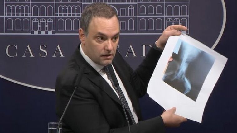FOTO: Manuel Adorni mostrando la radiografía del perro que se usó para obtener una pensión
