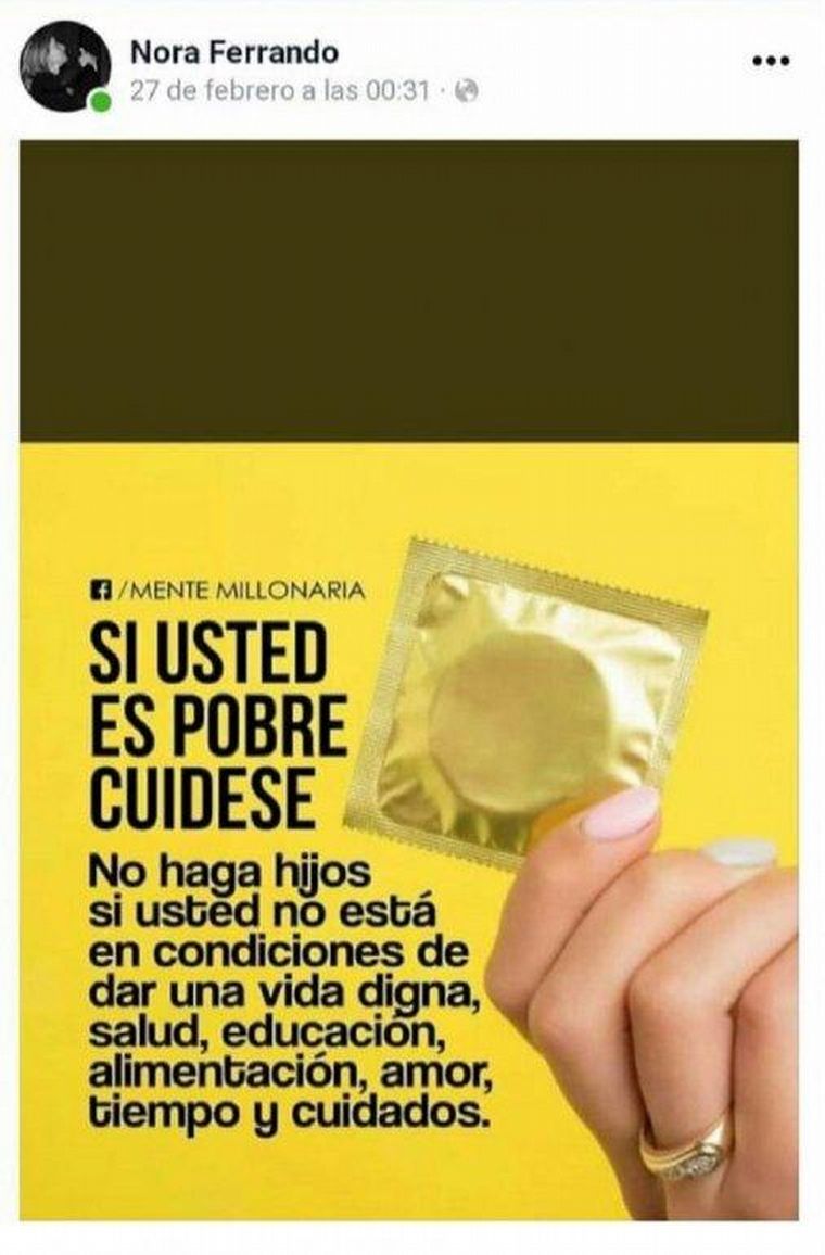 La directora de Cultura de la Municipalidad de Gualeguay, Nora Ferrando, compartió una polémica publicación en sus redes sociales, en la que se dirige a personas de bajos recursos y las insta a usar preservativos para no tener descendencia en caso de no poder hacerse cargo de la misma.