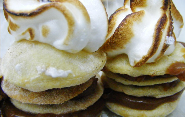 Untar cada disco con dulce de leche. Repetir la operación y superponer varios discos. Cubrir con merengue. Si se desea quemar el merengue.