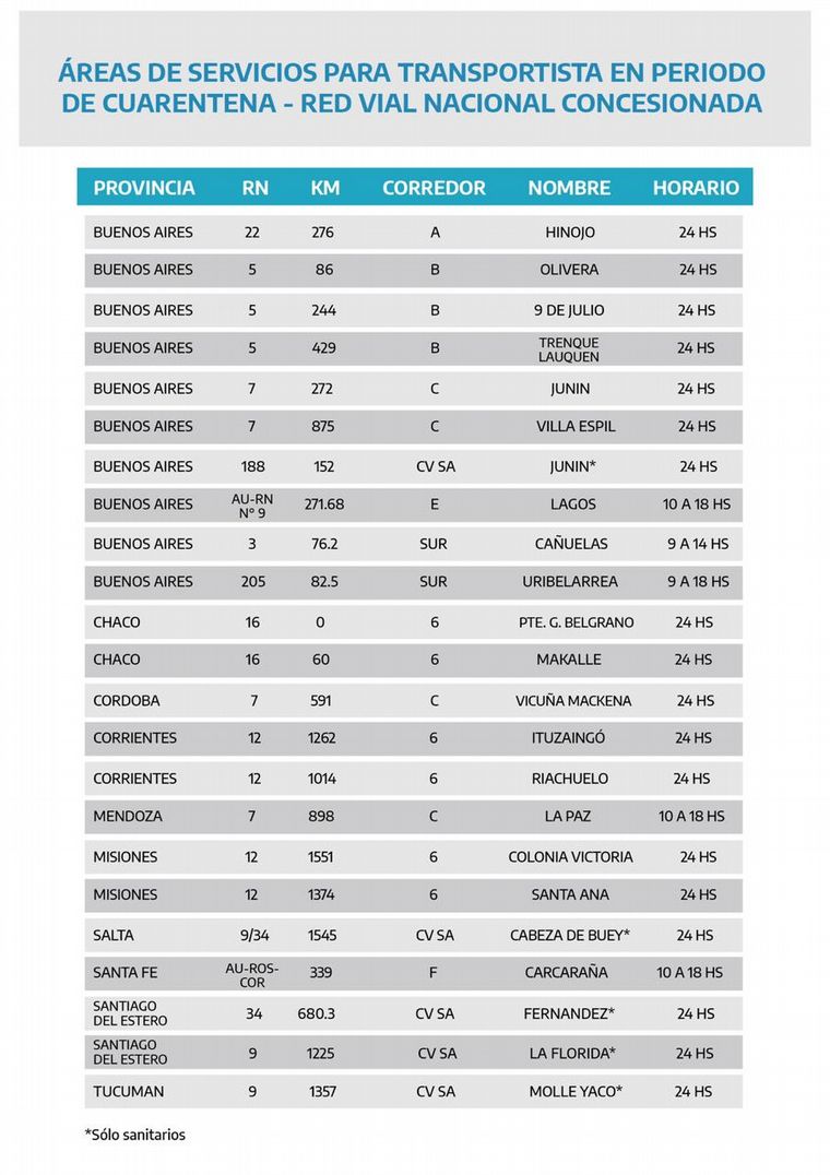 Con el objetivo de acompañar la medida dispuesta por el Gobierno nacional, mediante la cual los transportistas de productos esenciales deben continuar con su actividad, Vialidad Nacional autorizó a las empresas concesionarias –contratistas de la red vial nacional, a realizar la reapertura de las zonas de servicios para el uso exclusivo de transportistas. De esta manera, podrán acceder a determinadas áreas de descanso de los corredores, las cuales cuentan con sanitarios y, en su mayoría, duchas.