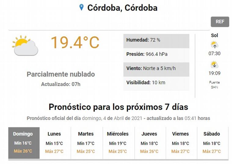 "Tiempo bueno. Nublado a parcialmente nublado. Vientos leves a moderados del sector norte y poco cambio de la temperatura. Máxima de 26 grados", informó este domingo el Observatorio Córdoba.