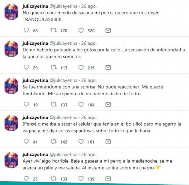 "Ayer viví algo horrible. Bajé a pasear a mi perro a la medianoche, se me acerca un pibe y me saluda. Al instante se tira sobre mi cuerpo. (Pensé que me iba a sacar el celular que tenía en el bolsillo) pero me agarró la vagina y me dijo cosas espantosas sobre todo lo que me haría. Se fue mirándome con una sonrisa. No pude reaccionar. Me quedé temblando", escribió.