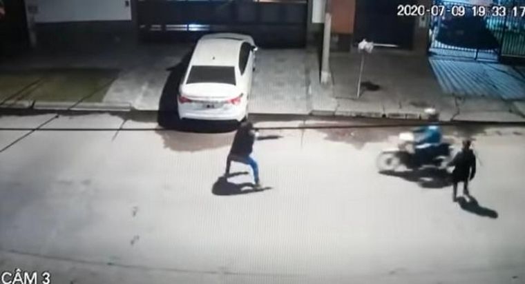 En el video, que fue grabado por la cámara de seguridad de una casa, se puede ver cómo uno de los delincuentes efectúa disparos que de milagro no hieren al motociclista.