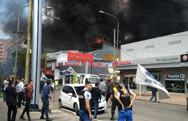 Las llamas y la oscura columna de humo se podían ver a varias cuadras a la redonda, y el tránsito permanecía cortado frente al paseo comercial siniestrado.