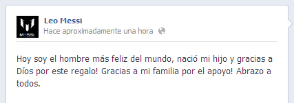El propio Lionel Messi lo confirmó en su cuenta de Facebook: "Hoy soy el hombre más feliz del mundo, nació mi hijo y gracias a Díos por este regalo! Gracias a mi familia por el apoyo! Abrazo a todos".
