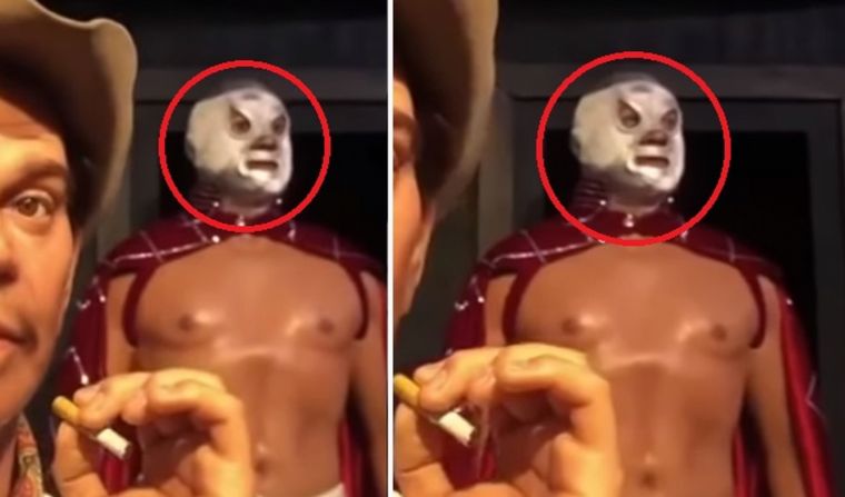 Mientras filma a las principales figuras de la historia de su país, se posa sobre "Cantinflas" y de fondo, el legendario luchador "El Santo", parece mover los ojos de manera ligera.