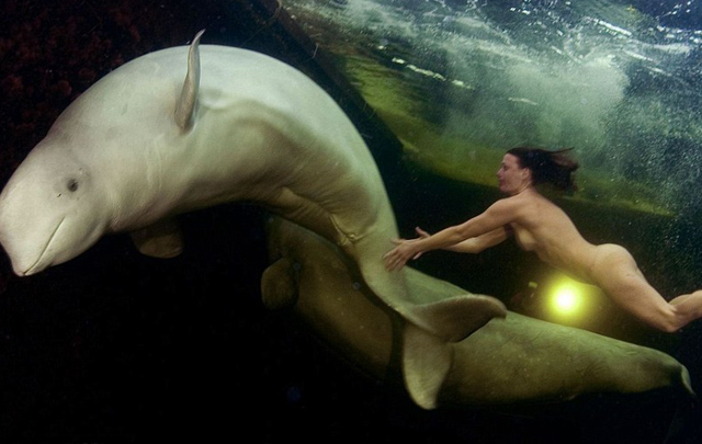 Debido a que las belugas huyen a todo tipo de material artificial con el que tomen contacto, Natalia Avseenko, de 36 años, asumió el reto de nadar desnuda en el frío mar Ártico, que en ese momento registraba una temperatura de 1.5º bajo cero.