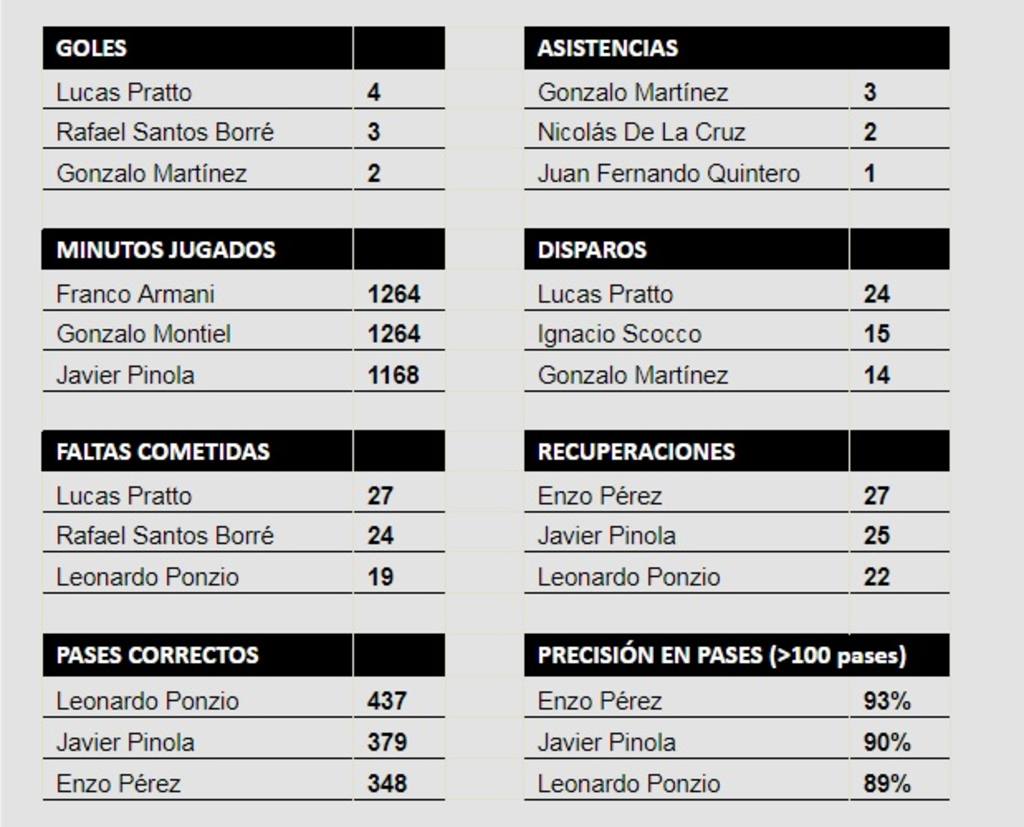 En la Copa Libertadores actual, 22 futbolistas sumaron minutos. Franco Armani, Gonzalo Montiel y Lucas Pratto jugaron los 13 partidos.