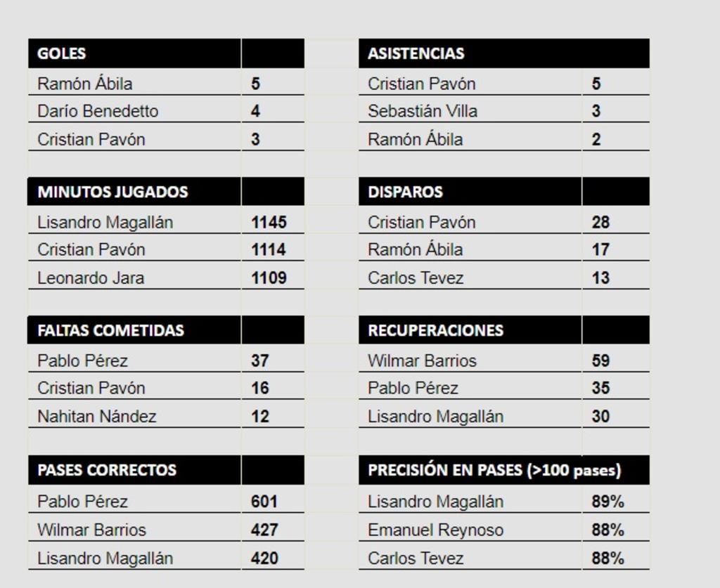 En Boca, en tanto, están Fernando Gago (17 PJ y 1 gol), Carlos Tevez (16 PJ y 4 goles), Pablo Pérez (16 PJ y 2 goles), Cristian Pavón (11 PJ y 1 gol), Lisandro Magallán (8 PJ y 1 gol), Ramón Ábila (6 PJ y 2 goles) y Darío Benedetto (6 PJ y 2 goles).