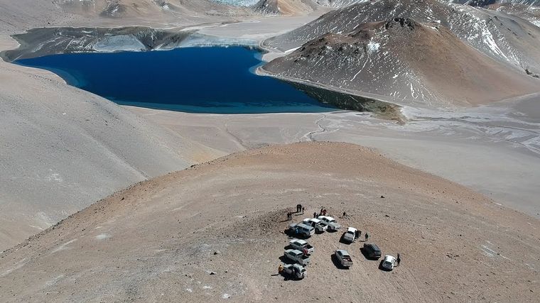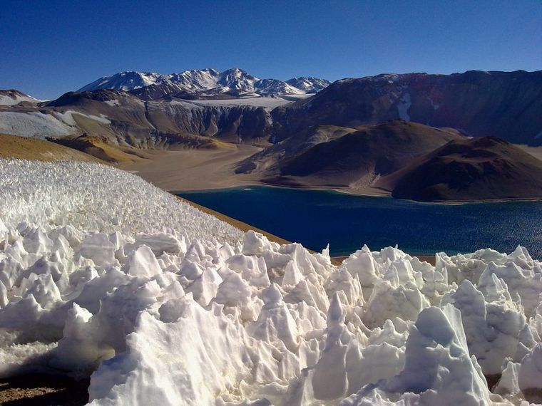 Del cráter apagado del volcán Corona del Inca, emerge el lago navegable más alto del mundo. También conocido como Inca Pillú, este espejo de agua azul se encuentra rodeado por los cerros Pissis, Bonete Chico y Grande, Veladero, Reclus, Baboso y Gemelos Norte y Sur. La laguna abarca 2 kilómetros de largo y un kilómetro y medio de ancho, y tiene 350 metros de profundidad aproximadamente. Se forma por los deshielos de estos penitentes que la rodean, por lo que sus aguas son de bajas temperaturas. La belleza en esta región de la Cordillera de los Andes es imponente.