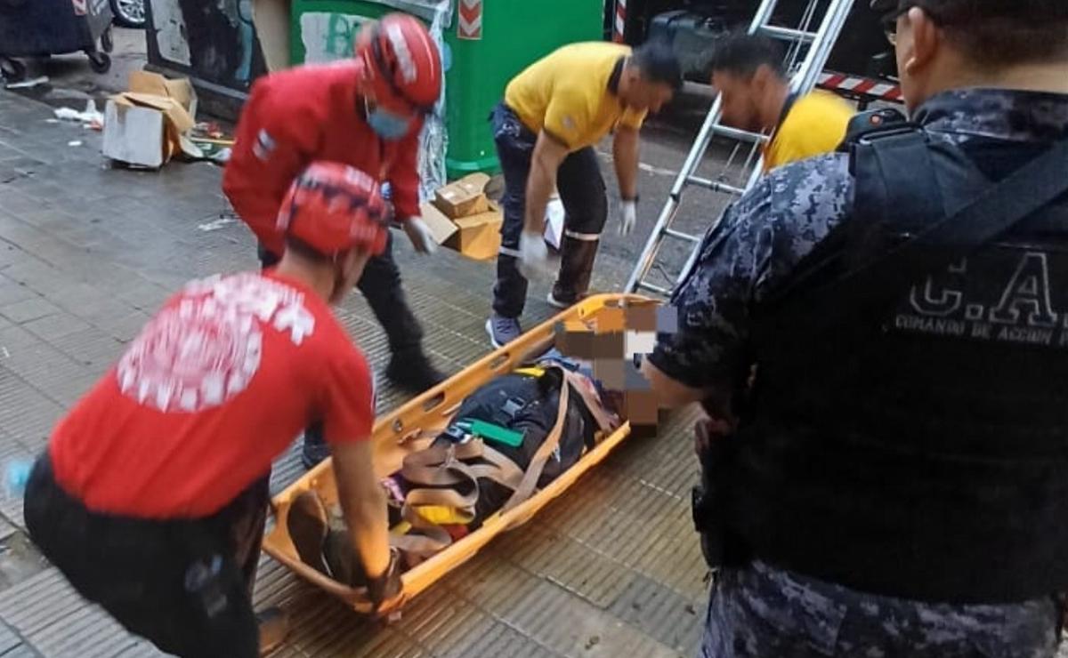 El hombre de 35 años, que estaba durmiendo en el contenedor de basura, fue extraído del camión con politraumatismos y derivado al Hospital Misericordia.