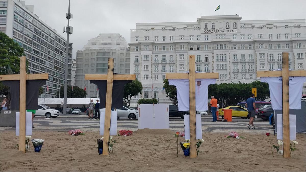 Frente al Copacabana Palace, en el corazón turístico de la ciudad, se montó un santuario con cruces que llevan remeras negras de la Policía Civil y Militar manchadas de rojo simulando sangre. Un cartel central dice: “Los derechos humanos no tienen lado”.