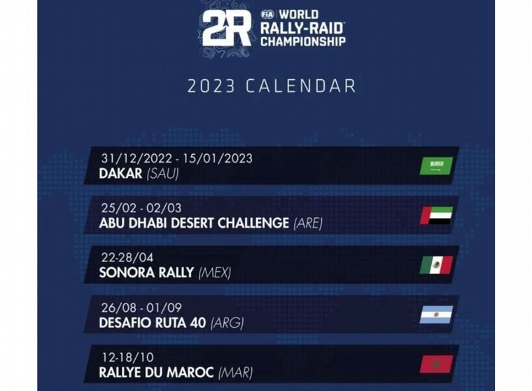 Los organizadores del Campeonato Mundial de Rally Raid FIA/FIM que están reunidos para la última fecha de la temporada en el Andalucía Rally, de España, dieron a conocer el calendario oficial de cinco fechas para 2023, confirmando la presencia de la carrera argentina "Desafío Ruta 40", que de esta forma le gana la pulseada al "Atacama Rally" de Chile que era la otra propuesta alternativa para América del Sur.