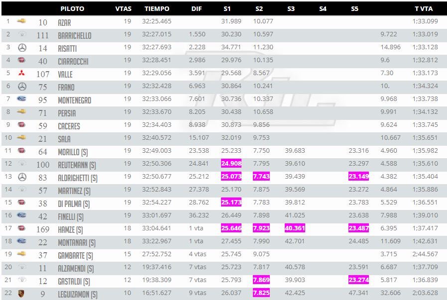 La conquista de Azar, fue desde el primer giro cuando Matías Rossi (Camry) y Franco Girolami (Mercedes) que largaron en la primera fila, se tocaron en una de las curvas a la izquierda, donde el cordobés fue al paso a alta velocidad y Rossi metros mas adelante quedó al margen por la rotura de la llanta delantera producto del toque.