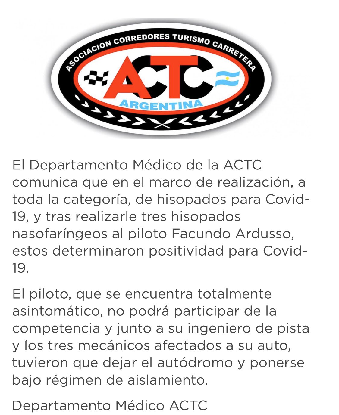 La comunicación oficial del Departamento Médico de la Asociación Corredores de Turismo Carretera llegó pasadas las 10:30 horas de hoy a los medios.