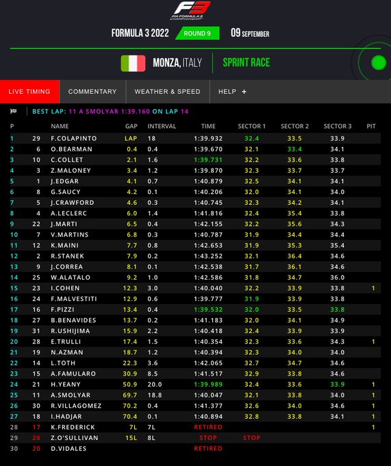 El argentino Franco Colapinto obtuvo la victoria en la carrera Sprint de Fórmula 3 en Monza, en la que los aspirantes al campeonato tuvieron suerte dispar y produjeron un duelo final entre los seis pilotos.