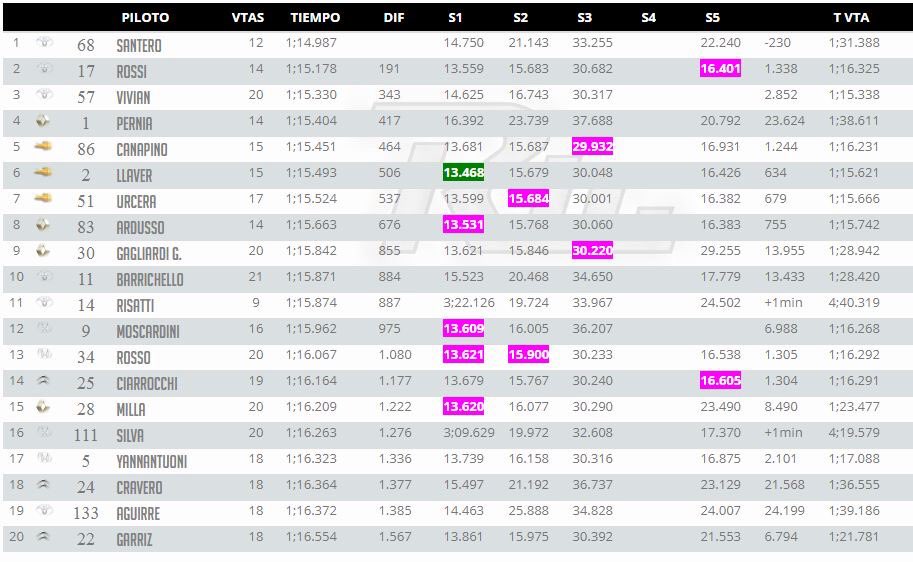 El actual campeó del Súper TC2000, Leonel Pernía, fue quién ubico al mejor de los Fluence del Renault Sport en el cuarto lugar a 417/1000, mientras que Agustín Canapino (Cruze) fuñe la referencia del equipo oficial Chevrolet en quinta posición a 464/1000.
