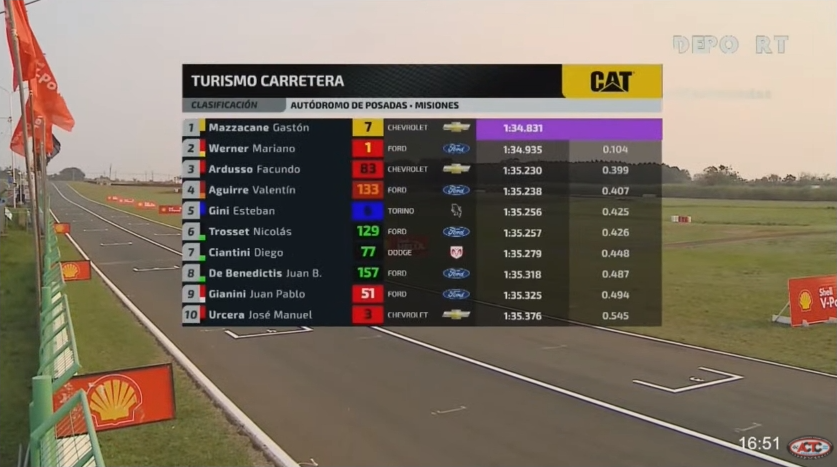 Gastón Mazzacane, el ex-Fórmula 1 y a quién apodan "El Rayo", se quedó con el mejor registro en la provincia de Misiones al marcar 1’34”831/1000 a bordo de su Chevrolet N°7, demostrando una gran performance del medio mecánico. Este domingo largará desde el mejor lugar en la primera serie a las 9:55, buscando denodadamente ingresar entre los 12 pilotos que quedarán para luchar por la "Copa de Oro" en los 5 últimos compromisos de la categoría.
