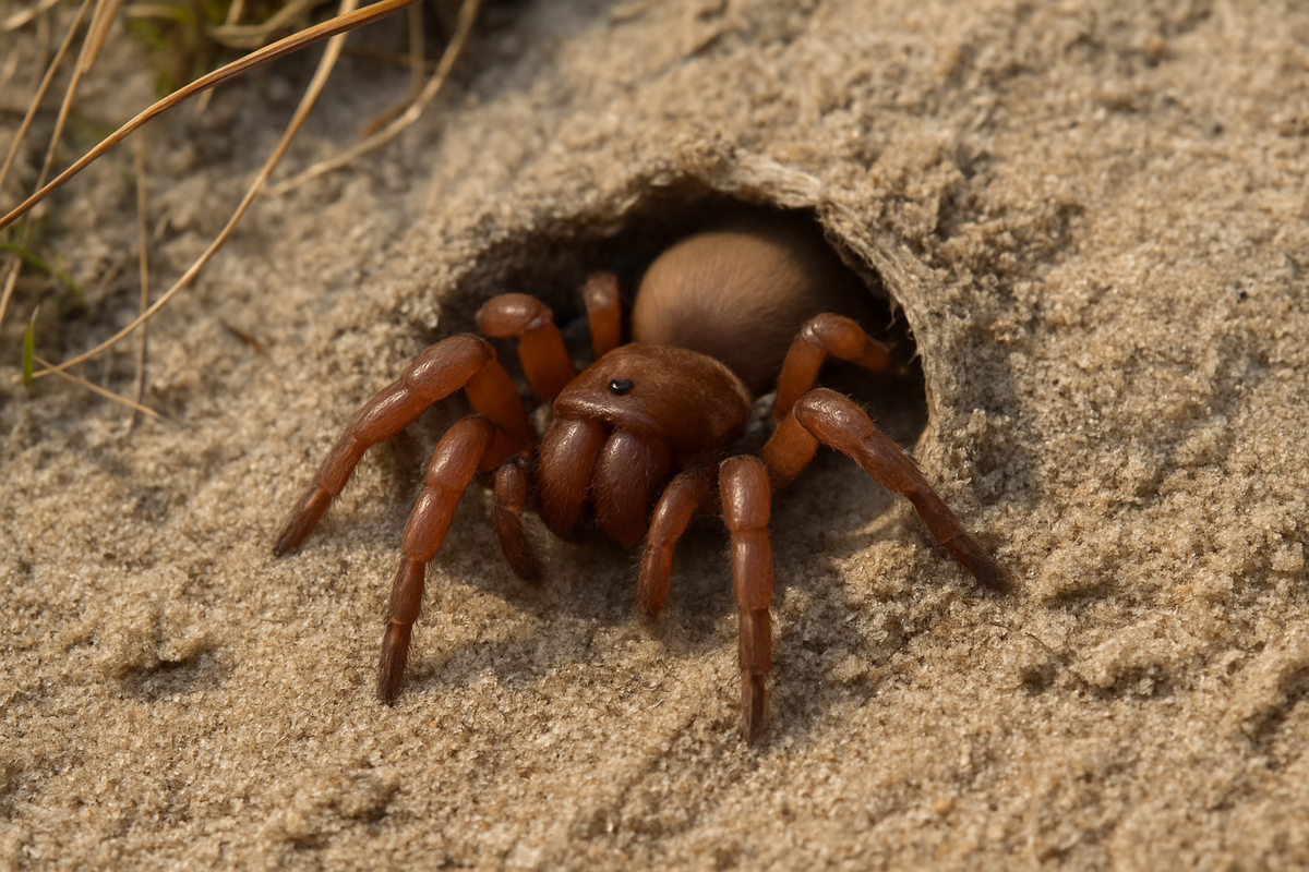 Las arañas trampa son parientes pequeñas y secretivas de las tarántulas. Las hembras pasan toda su vida en madrigueras subterráneas, forradas de seda, que se cierran con una puerta camuflada. Permanecen inmóviles, esperando vibraciones en la superficie para salir rápidamente cuando un posible alimento se acerca.