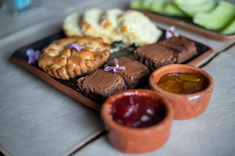 El desayuno lleva la impronta de Karina Cortéz, una artista local, socia de Rosana y Daniel, con una mano privilegiada para los amasijos y dulces caseros que prepara a diario para sorprender a los huéspedes.