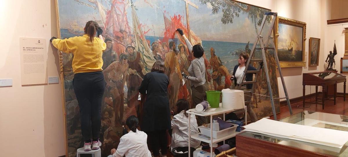 El cuadro 'Primer homenaje a Cristóbal Colón' fue atacado el domingo con pintura roja biodegradable por activistas.