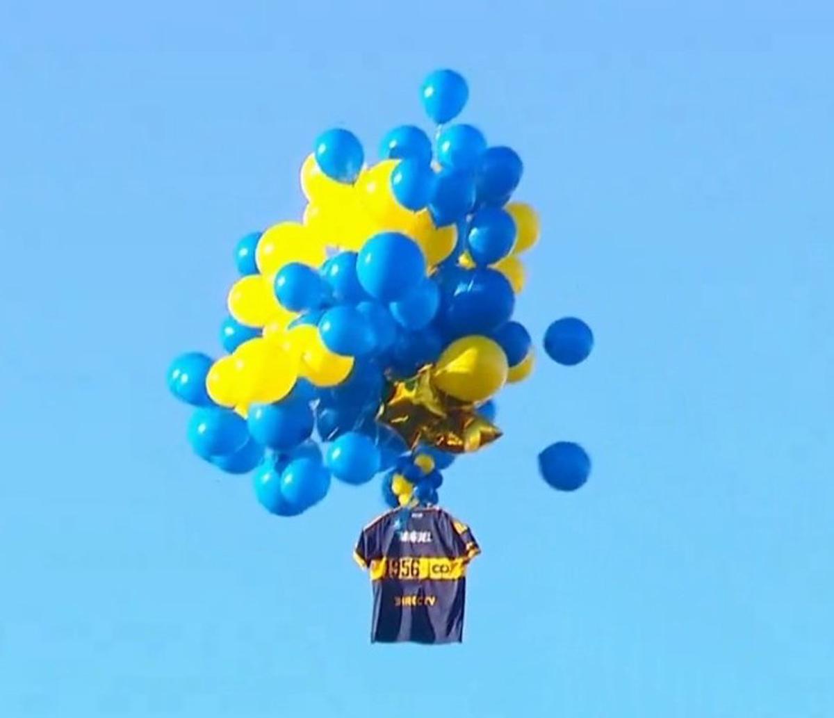 Esta casaca era sostenida por globos y, al soltar la camiseta Paredes y Úbeda, la remera tomó dirección hacia el cielo bajó una lluvia de aplausos y la emoción de los 'Xeneizes'.