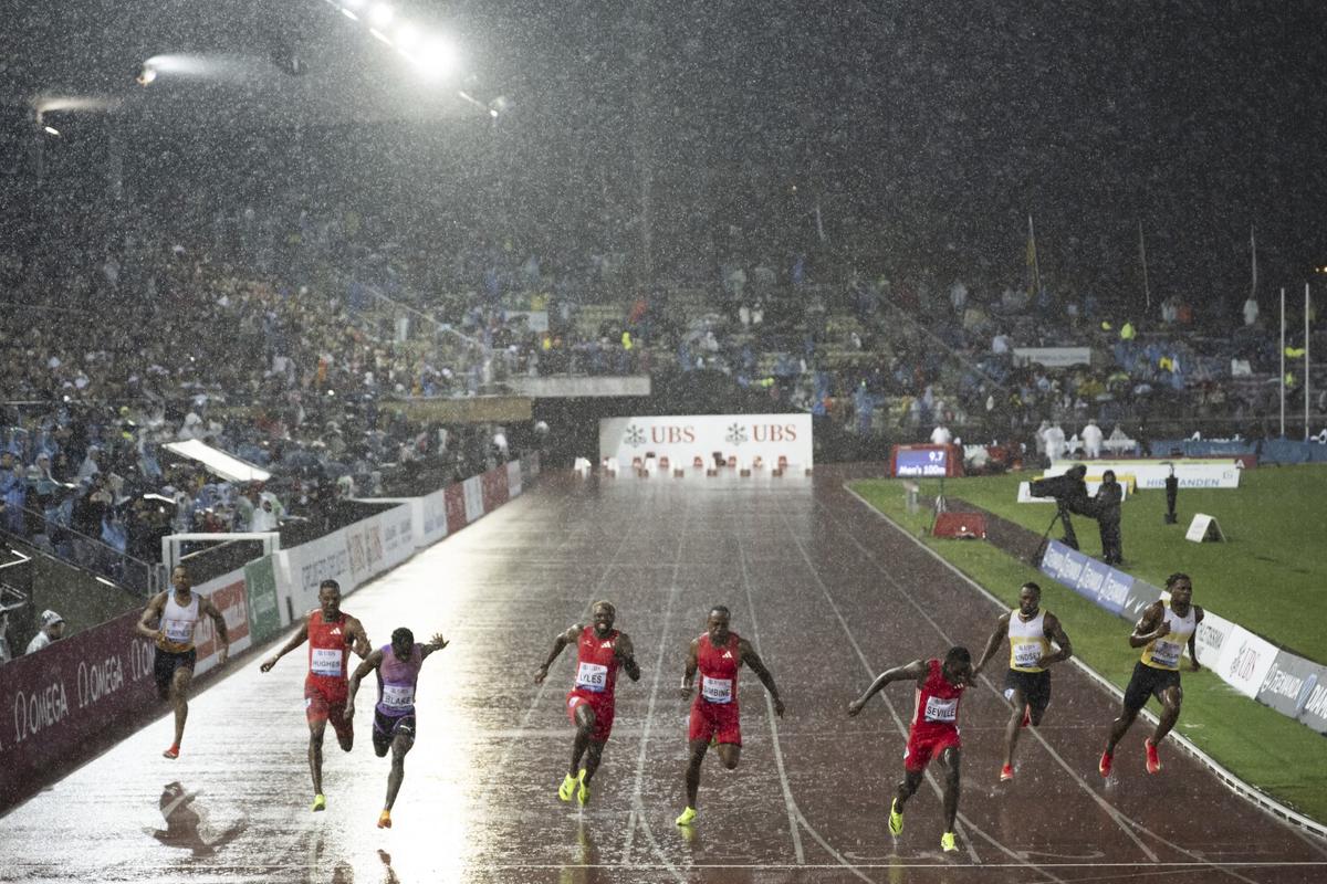 Seville desafió la lluvia constante y el agua estancada en la pista para impresionar con un tiempo de 9,87 segundos, apenas una centésima por encima de su tiempo ganador en Londres el mes pasado, cuando Lyles también quedó segundo en una temporada que comenzó tarde por lesiones.