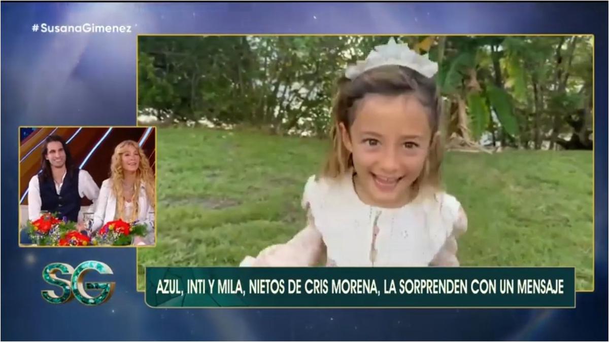 Según supo Noticias Argentinas, el momento corresponde a una entrevista que Susana Giménez le realizó a la productora en octubre del año pasado. Cris Morena estaba en el piso con sus nietos mayores, Franco y Valentín Giordano, cuando la producción la sorprendió con saludos grabados del resto de sus nietos.