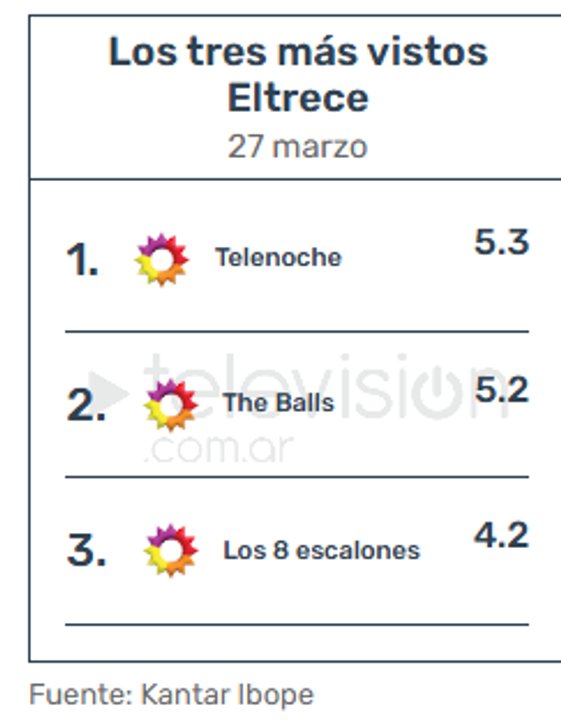 El programa Telenoche se posicionó favorablemente, aunque no logró vencer a su principal competidor, Telefe Noticias, que sigue siendo un referente en la programación. Kaczka, por su parte, ocupó el segundo y tercer puesto del ranking con sus programas: The Balls y Los 8 Escalones, que reportaron 5.2 y 4.2 puntos de rating, respectivamente.