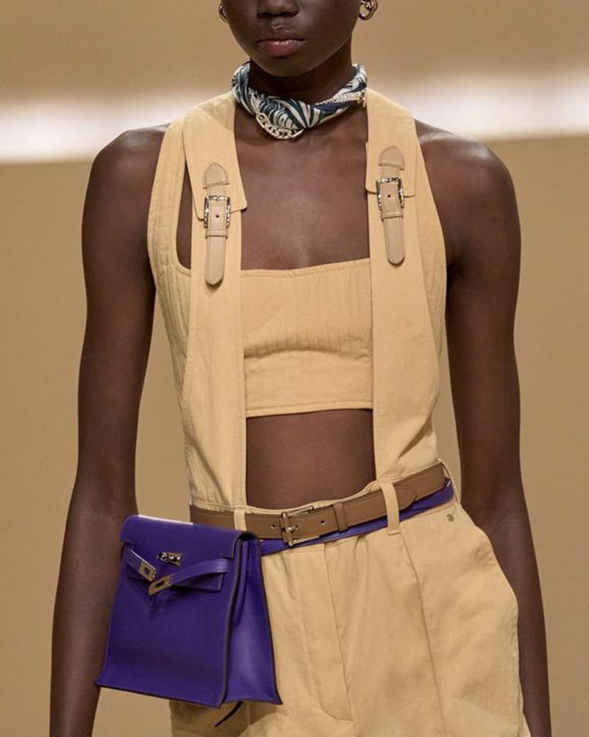 Los accesorios destacados son el bolso sobre el cinturón, cinturones XL, gafas de sol con detalles inesperados, collares colgantes, bolsos de gran tamaño y texturas de calidad.