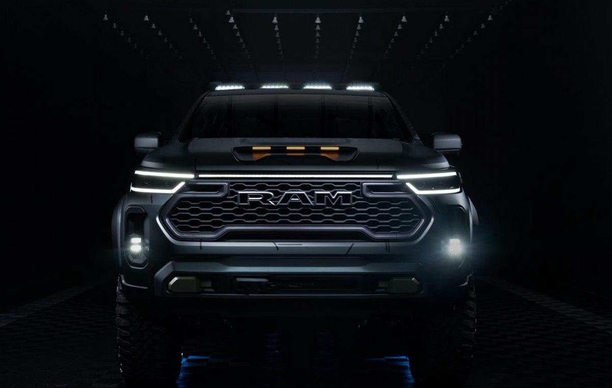El Nightfall Concept destaca por su diseño imponente y su identidad RAM, reflejada en cada detalle. En el frente, una imponente parrilla con el nombre RAM calado domina la escena, enmarcada por una firma lumínica LED que recorre la parte superior y conecta con los faros también en tecnología LED.
