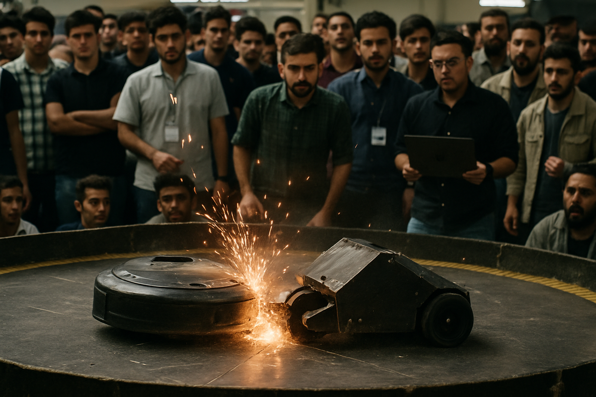 En un evento lleno de adrenalina, dos máquinas que se asemejaban a aspiradoras robóticas se enfrentaron en un ring, chocando entre sí, generando chispas y, en ocasiones, incendiándose, mientras estudiantes de ingeniería iraníes observaban desde detrás de un panel de plexiglás.