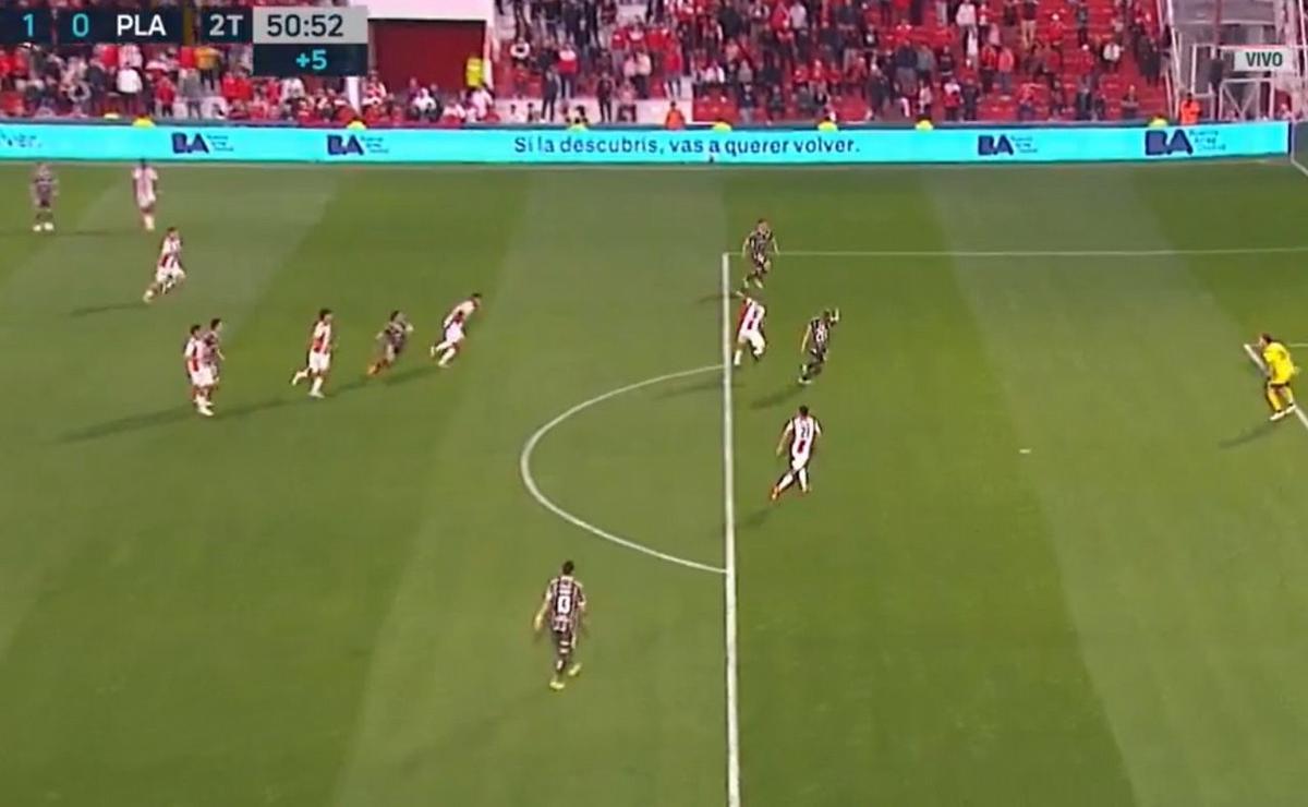 Tras un pelotazo de Vicente Taborda, Ronaldo Martínez ganó de cabeza y habilitó a Ignacio Schor que controló la pelota con la mano antes de ejecutar una media chilena que terminó siendo centro para que el delantero Martínez la empuje y lo empaté.