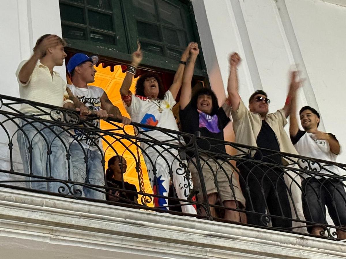 Finalmente, la ovación llegó cuando “La Mona” salió al balcón del Cabildo para saludar a los presentes. El artista no estuvo solo: lo acompañaron Damián Córdoba, Cachumba, Fer Olmedo, Joaco Martín de Desakta2 y Simón Aguirre, en una postal que reunió a distintas generaciones y expresiones del cuarteto.