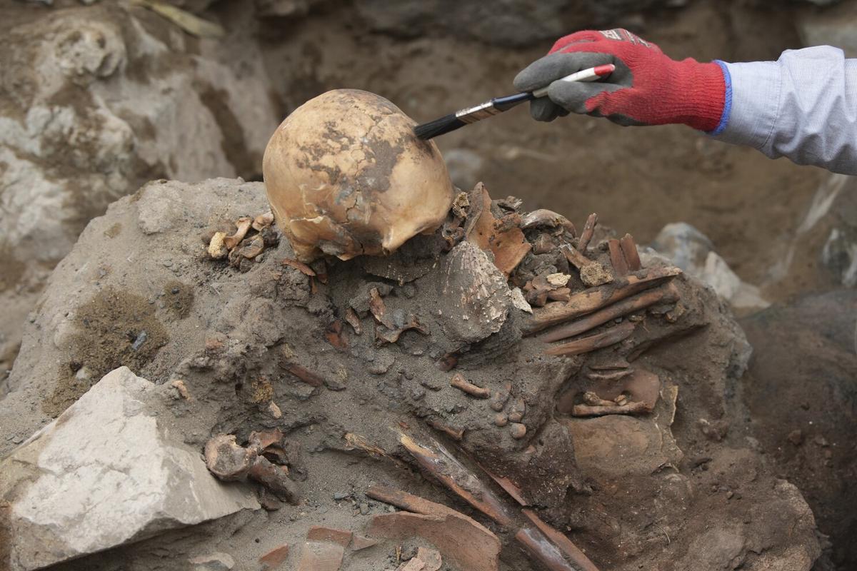 Esta vez hallaron, a menos de un metro de la superficie, cinco esqueletos divididos en dos grupos. En un punto ubican tres entierros junto a vasijas de arcilla pintadas de blanco y rojo, una característica típica de la cultura preincaica llamada Lima con una antigüedad de entre 2.000 y 1.800 años.
