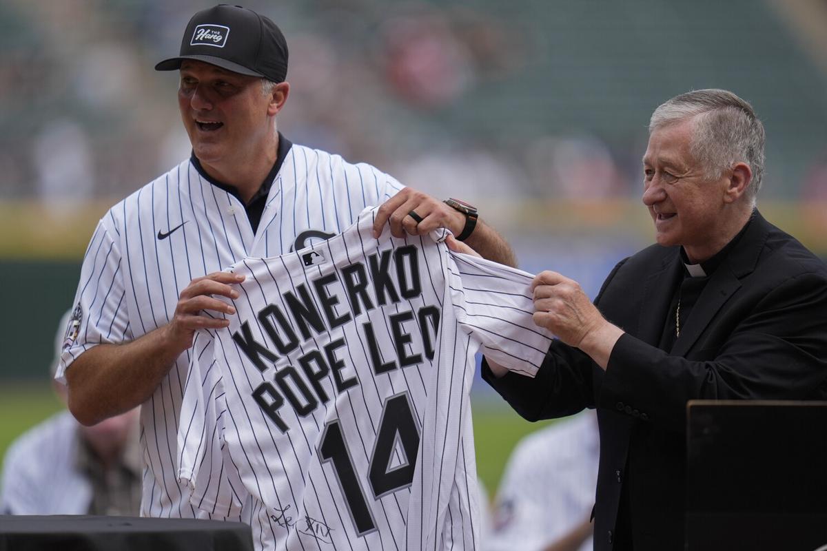El cardenal Blase Cupich, arzobispo de Chicago, le entregó a Konerko la prenda con la firma del nuevo pontífice en la parte posterior durante una ceremonia antes del juego contra los Guardianes de Cleveland. El jersey tenía el apellido del pelotero seis veces elegido al Juego de Estrellas, y decía “papa Leo” sobre el número 14.
