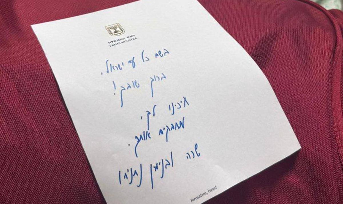 ¿Qué dice la misiva? "En nombre de todo el pueblo de Israel, ¡bienvenido de regreso! Te esperábamos, abrazándote. Sara y Benjamín Netanyahu”.