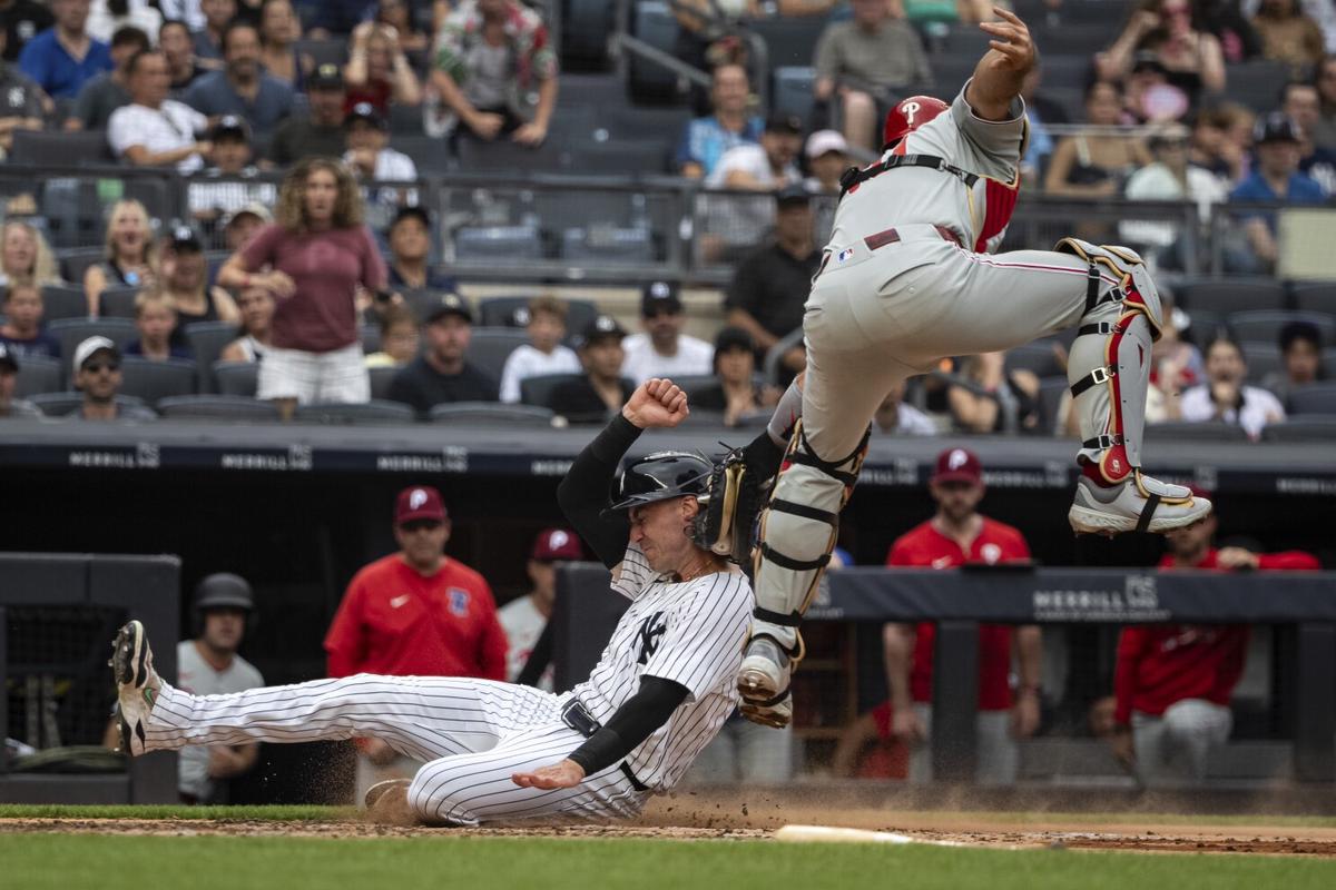 El receptor de los Filis, J.T. Realmuto, hizo una espectacular atrapada en salto y tocó a Cody Bellinger en el plato para un doble play que puso fin a la entrada y negó a los Yankees una carrera en la tercera.