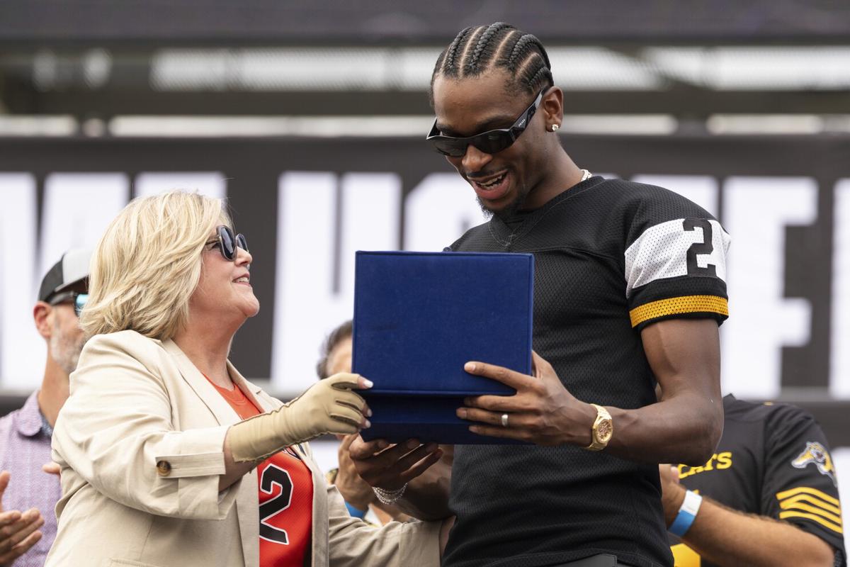 HAMILTON, Canadá (AP) — Shai Gilgeous-Alexander, el Jugador Más Valioso de la NBA, recibió la llave de la ciudad de Hamilton de manos de la alcaldesa Andrea Horwath durante un acto público realizado el jueves en el estadio local.