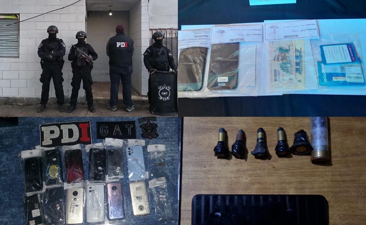 Entre lo incautado se encuentran veinte teléfonos celulares, seis blisters de chips telefónicos, municiones modificadas de distintos calibres —incluyendo proyectiles alterados con cinta adhesiva y alambre de cobre—, una tarjeta de crédito, cincuenta mil pesos en efectivo y 2,2 gramos de marihuana.
