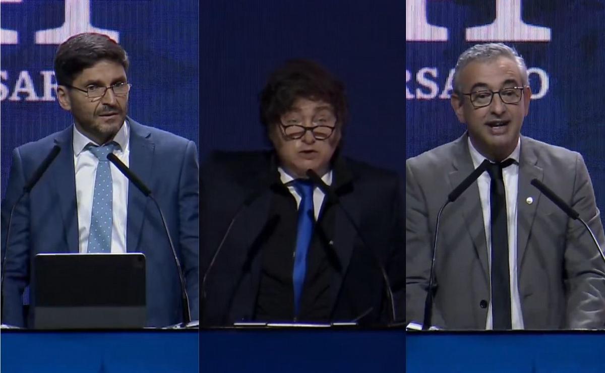 Milei, Pullaro y Javkin, en la Bolsa de Comercio de Rosario.