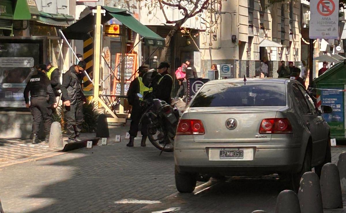 Personal policial encontró más de 50 vainas servidas calibre 45 desparramadas en la cuadra de Sarmiento al 700, a metros de la peatonal Córdoba. La escena incluía casquillos esparcidos en la vereda, junto a un contenedor de residuos, frente a una sucursal bancaria y debajo de las mesas de un bar.