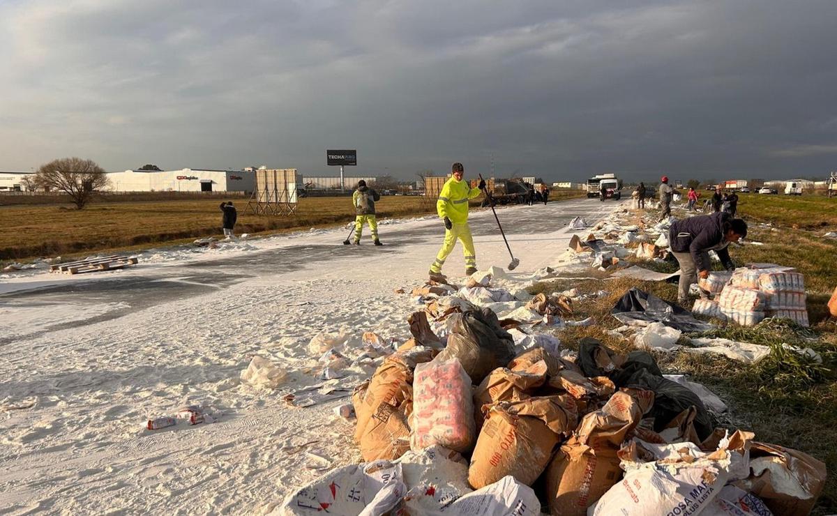 ¿Cómo se están manejando las consecuencias? Se implementaron desvíos y se trabaja en la limpieza del asfalto dañado por el contenido derramado de los camiones.