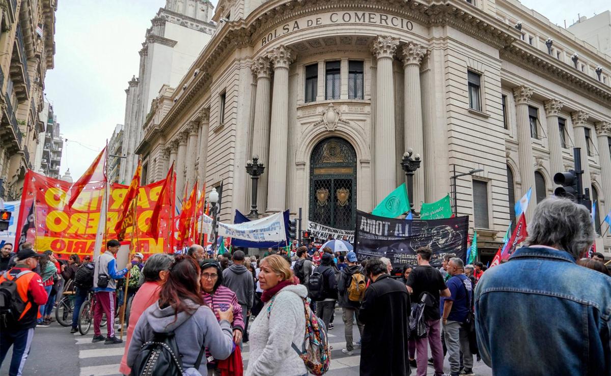 La movilización concluyó frente a la Bolsa de Comercio. Allí denunciaron avance de la pobreza, despidos masivos y pérdida del poder adquisitivo de los salarios.