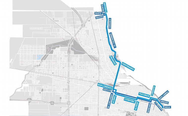 IDA: Desde Av. Belgrano y Rioja, por Av. Belgrano (calle lateral), Sgto. Cabral, Urquiza, Entre Ríos, Santa Fe, Bv. Avellaneda (sentido Sur-Norte), Viaducto E. Pinasco, Bv. Avellaneda, Av. Centenario, Av. A. Frondizi, Av. C. Colombres, Av. Eudoro Carrasco, Galicia, Iriarte, P. Musto hasta Iturraspe.
