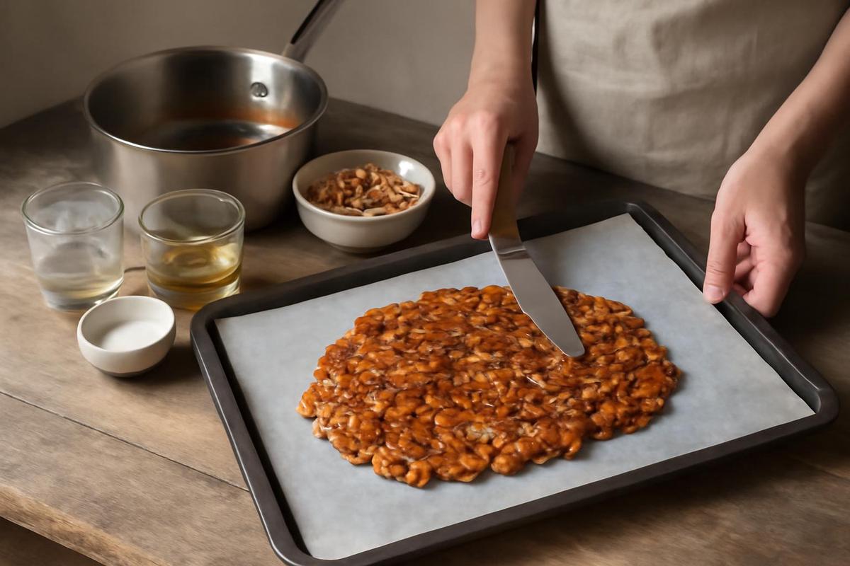 El Crocante de Almendra se transfiere a la bandeja de horno previamente preparada y, en pocos minutos, estará listo para ser utilizado como decoración en tus postres o tortas favoritas.